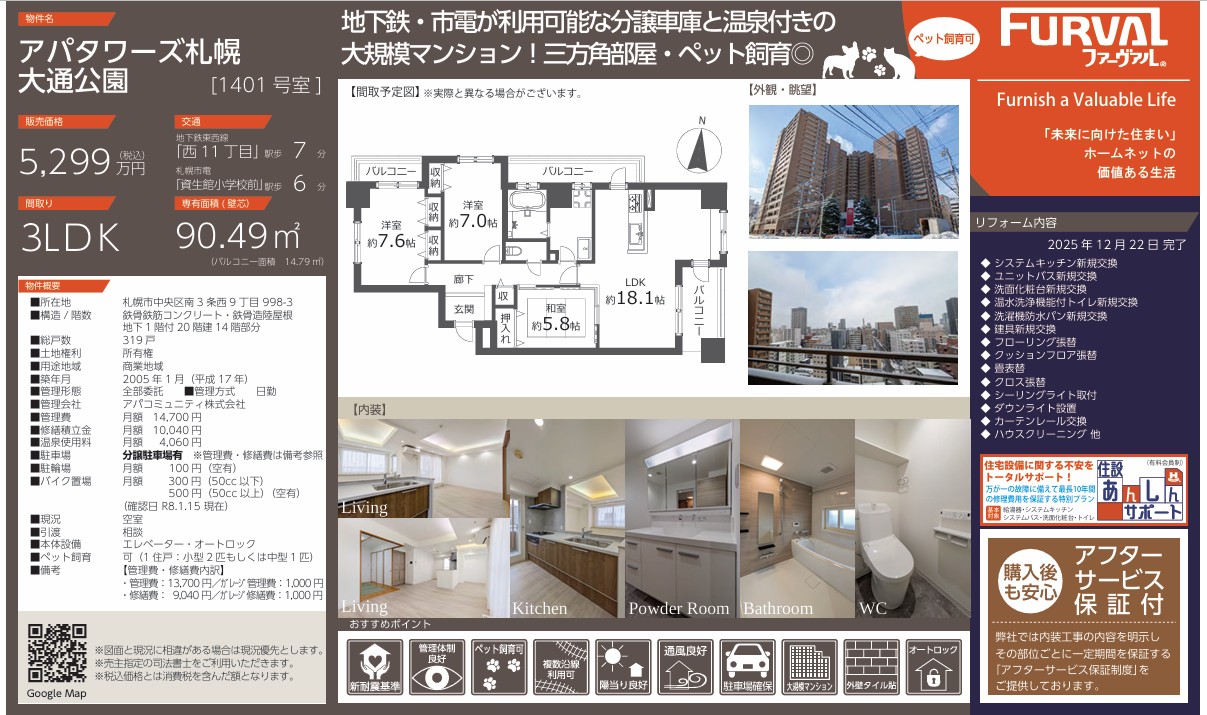 【札幌市中央区・大通エリア】温泉付き×駐車場確保済|90㎡超・3LDK三方角部屋のフルリフォームマンション